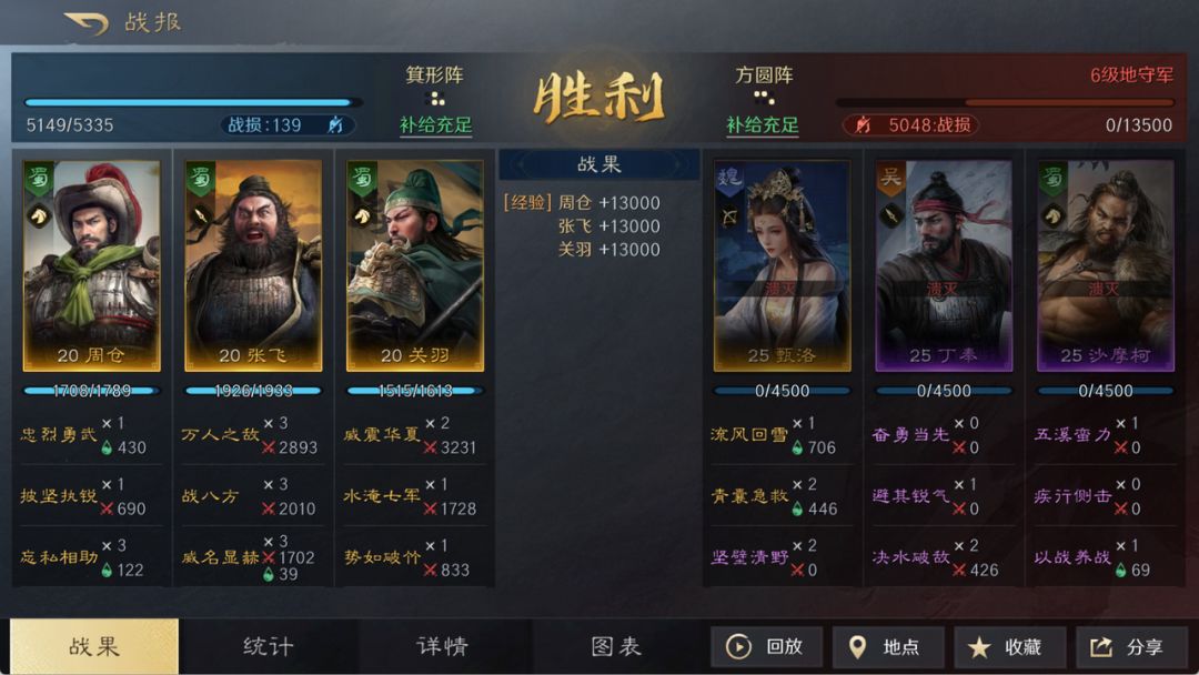 从20级起改用【箕形阵】,周仓携带【披坚执锐】提升坦度,依靠张飞和关羽的战法联动性同时造成伤害和控制。