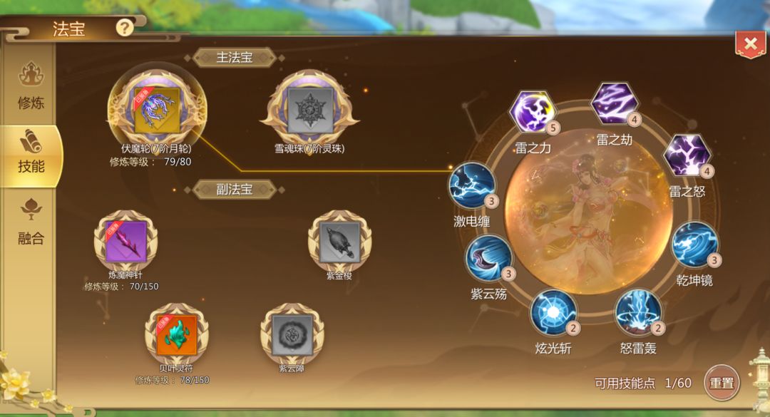 月轮:最优先点乾坤镜这个技能,主要是为了输出循环考虑,能打进3个炫光斩+1乾坤镜的循环。其次是雷之力、雷之劫、雷之怒三个技能。喜欢挂机的也可以先点被动。