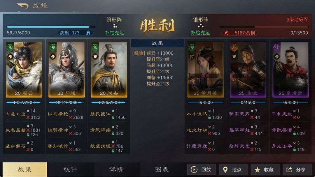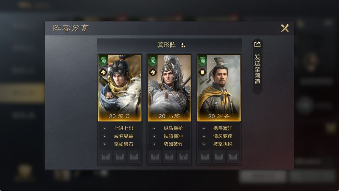 从20级起改用【箕形阵】,赵云前排承伤同时也能输出,刘备治疗保证队伍续航能力,马超依靠自身高暴击在后排主力输出。