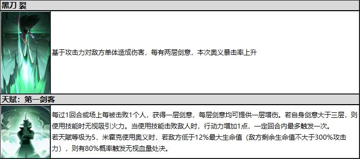 天赋:第一剑客为鹰眼提供了高额增伤和额外行动,且能够无视[吸引火力]效果,弱化敌方坦克的保护效果。天赋等级为5时,新增无视血量处决机制。