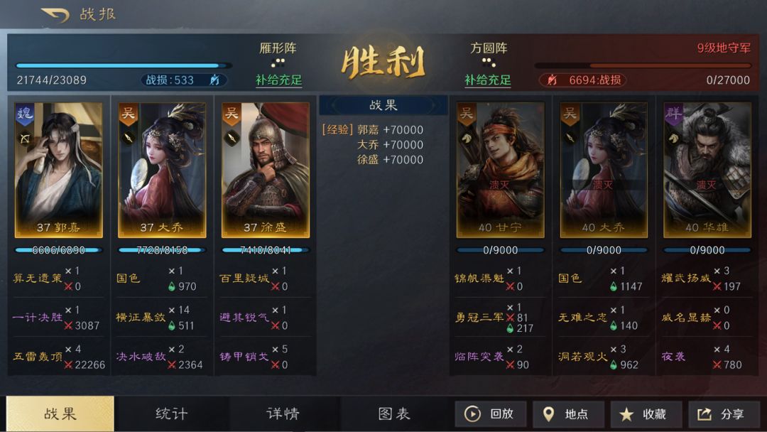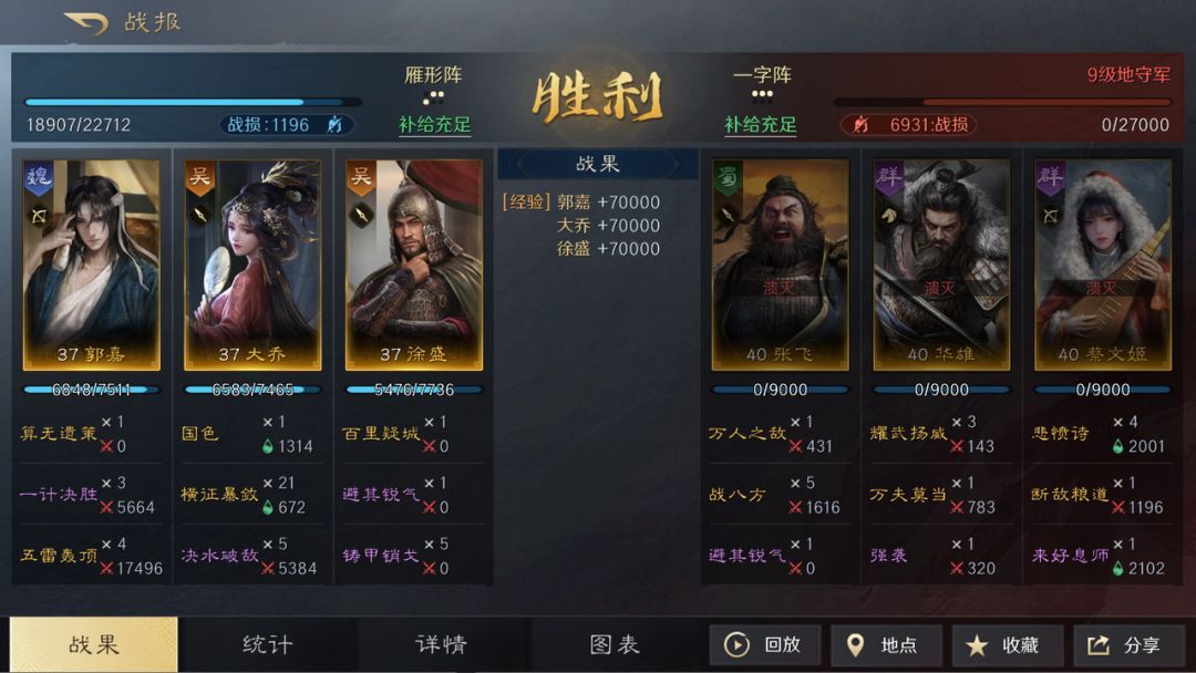 这套阵容的输出能力毋庸置疑,但建议开地时优先选择无法造成“技穷”效果的敌人战斗,平级开地基本都是中低战损,前期没有解锁【雁型阵】前,可以暂时用【箕形阵】,游戏前期如果抽到郭嘉可以尝试这套搭配。