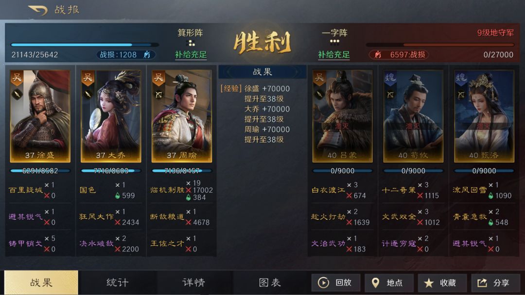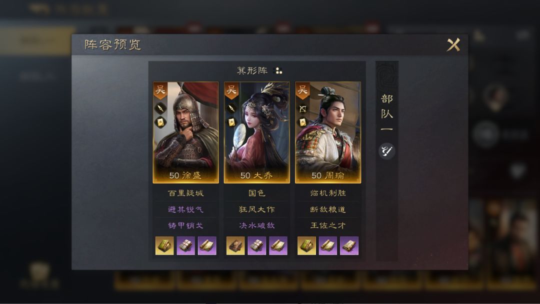 这套阵容的输出很稳定,多个指挥战法搭配保证了整体伤害的下限,多重异常状态施加保障了周瑜【临机制胜】的触发频次,平级开地都是中低战损,游戏前期如果抽到周瑜可以尝试这套搭配。