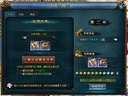 VIP3及以上权限的玩家,点击【一键完成按钮】按钮,即可花费元宝完成本日剩余的全部仙道任务,奖励以满星标准发放。
