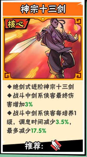 效果:战斗中剑系侠客每培养1级,调息时间减少3.5%,最多减少17.5%,最终伤害增加3%