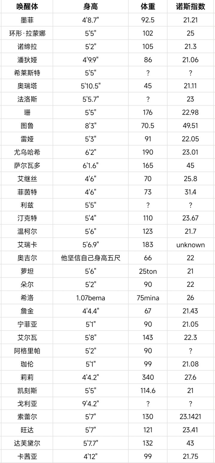 女性唤醒体中身高最高的是小水母奥瑞塔,领先第二名大福袋儿将近三英尺,同时除了体重未公开的唤醒体,小水母也是所有唤醒体中最轻的,只有45lbs,换算得20.4kg,相当于四十瓶500ml可乐,bmi更是只有6.4,低于18.5算偏瘦,小水母是偏偏偏瘦