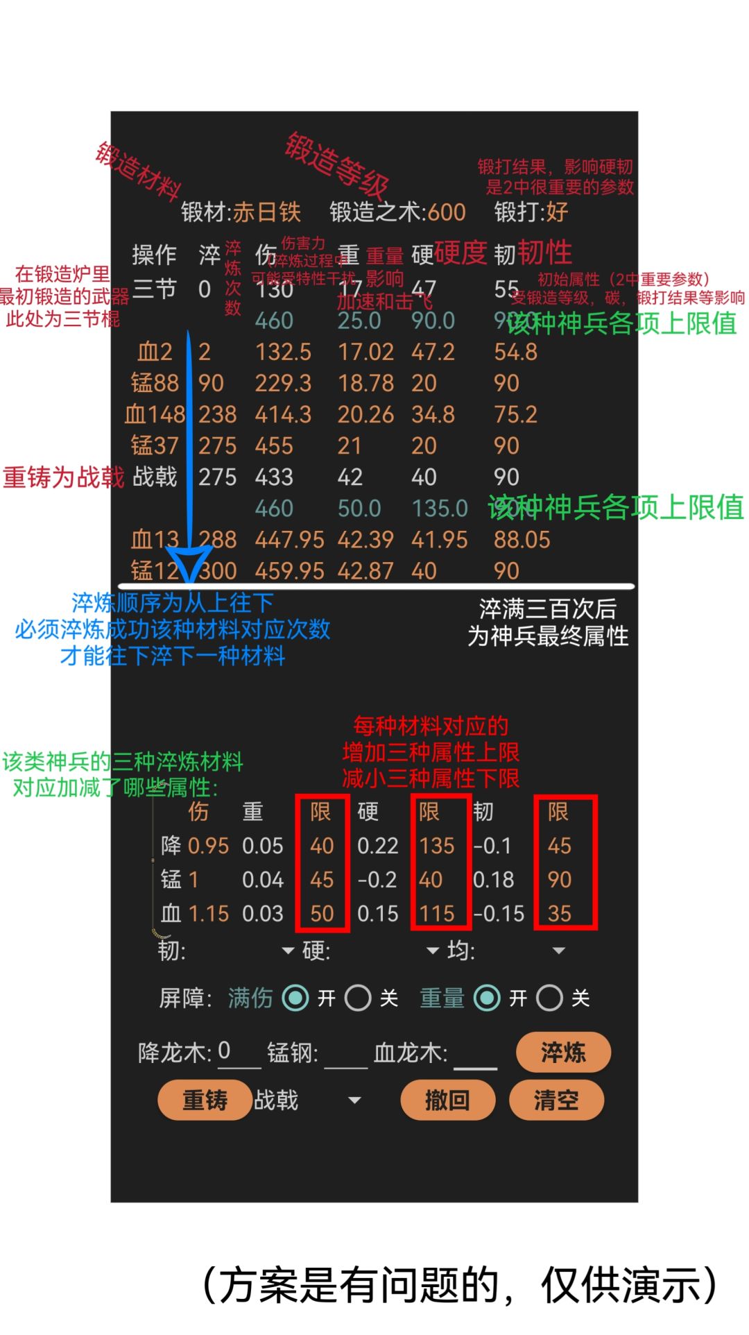 因为各位少侠的锻造等级不同,因为怕浪费碳省碳等原因加的碳量不同,锻打结果不同,哪怕锻打结果相同系统给的硬韧也不同,所以每个人的胚子大概率是和方案不一样的,因此我们需要在打神兵前进行模拟(主要模拟锻造等级加碳量看伤害力),在胚子锻打后模拟(主要看系统给出的硬韧,只有很少的部分神兵类型方案上直接取最低值),以自行校准方案。