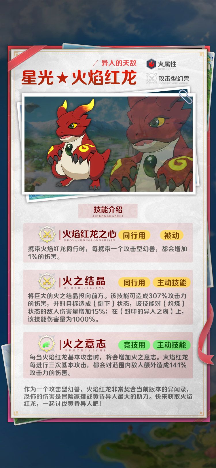 作为一个攻击型幻兽,火焰红龙非常契合当前版本的异闻录,恐怖的伤害是冒险家挑战黄昏异人最大的助力。快来获取火焰红龙,一起讨伐黄昏异人吧!