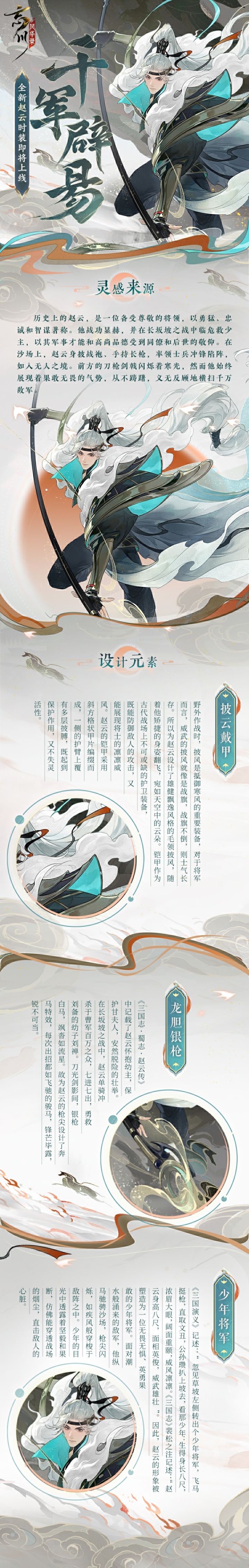 赵云全新时装「千军辟易」将于5月1日上线,小麒麟抱来了设计灵感分享,使君大人快来欣赏更多细节展示吧~