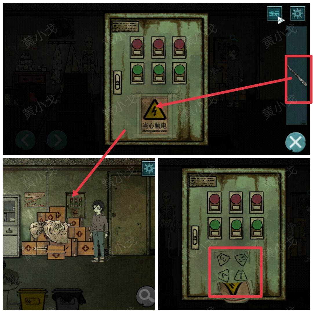 17.点击电箱,用【手术刀】割开贴纸,获得线索(3841及对应的扇形形状:3-右下、8-左下、4-右、1-下)