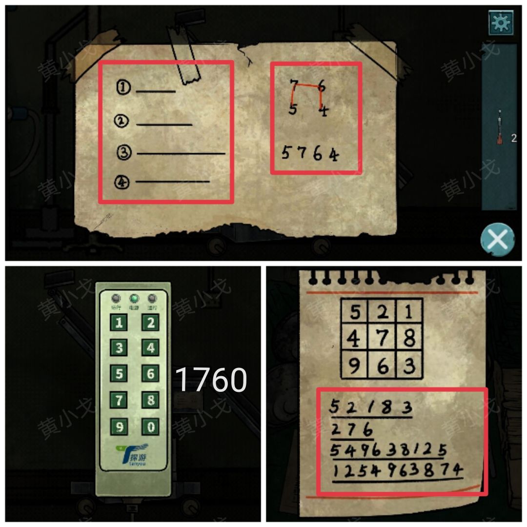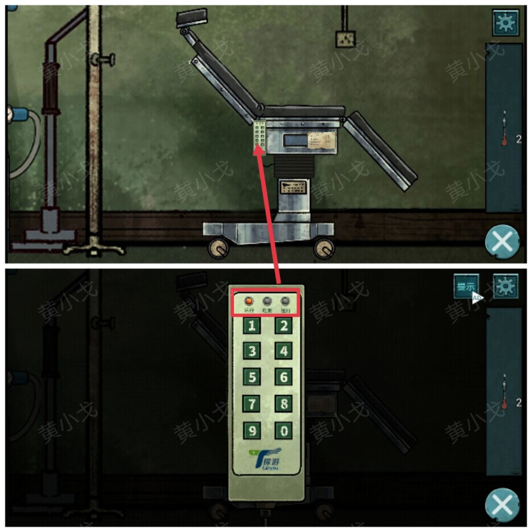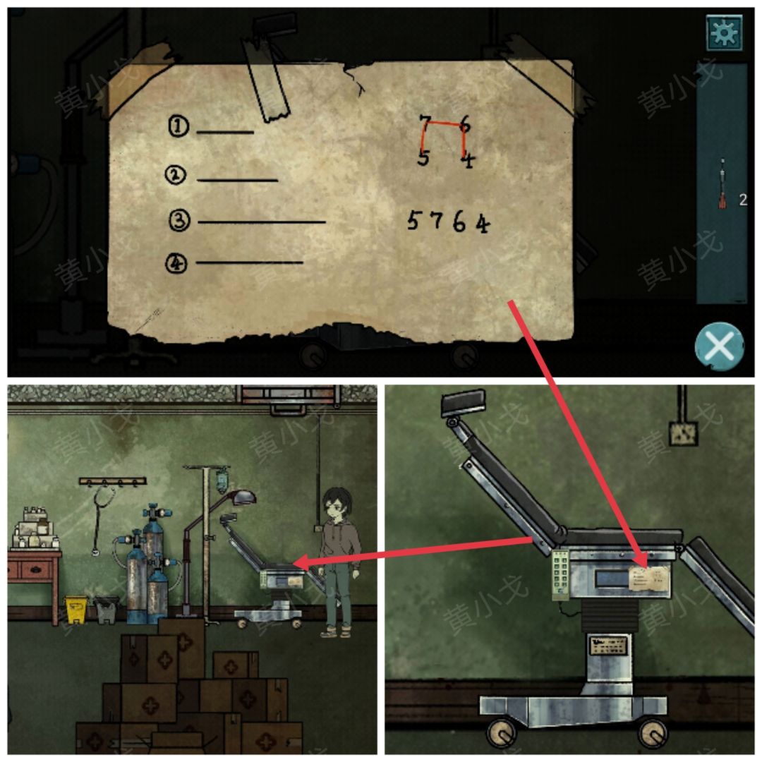 26.(诊所-场景4)点击手术椅上的密码锁,根据便签内容和贴在仪器上的纸条,推出密码(52183:7、276:1、549638125:0、1254963874:6),输入密码:1760
