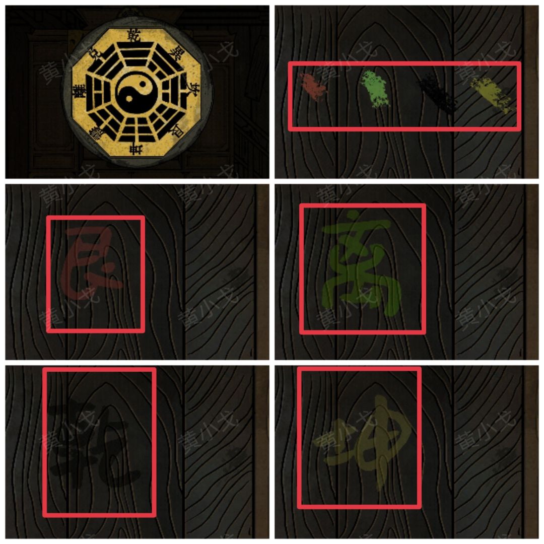 8.(二楼-过道)点击查看棺材上的涂鸦(从左到右:离-绿、坤-黄、震-蓝、艮-红、老鼠、乾-黑、红绿黑黄)