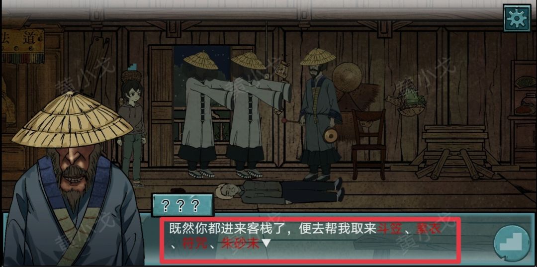 1.(一楼)触发剧情,获得线索(需要斗笠、素衣、符咒、朱砂末)