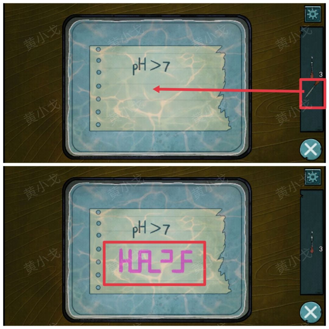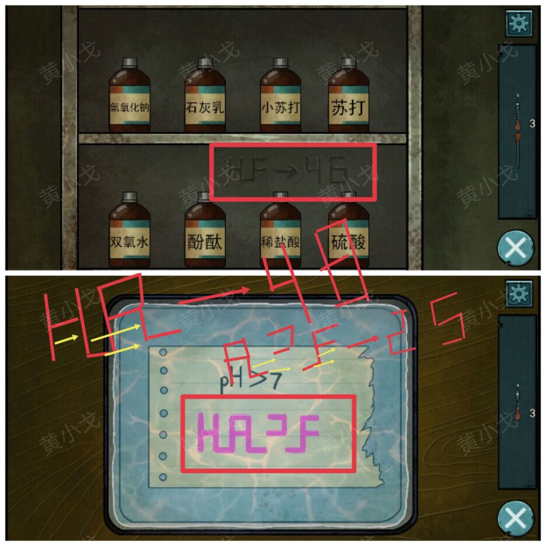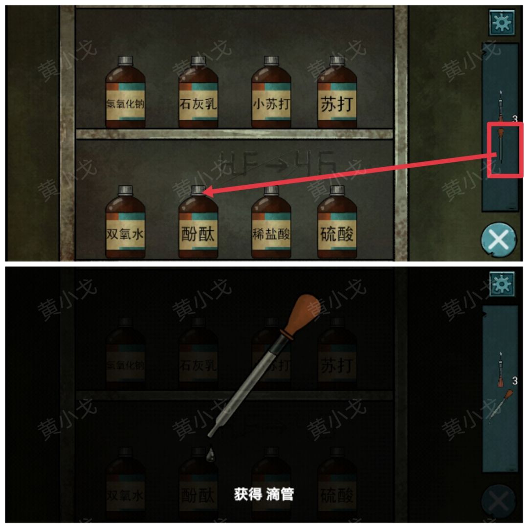 32.点击箱子上的密码锁,根据柜子上的线索,结合滴过酚酞试剂后显现在纸上的线索,调整密码为:4825(移两格)