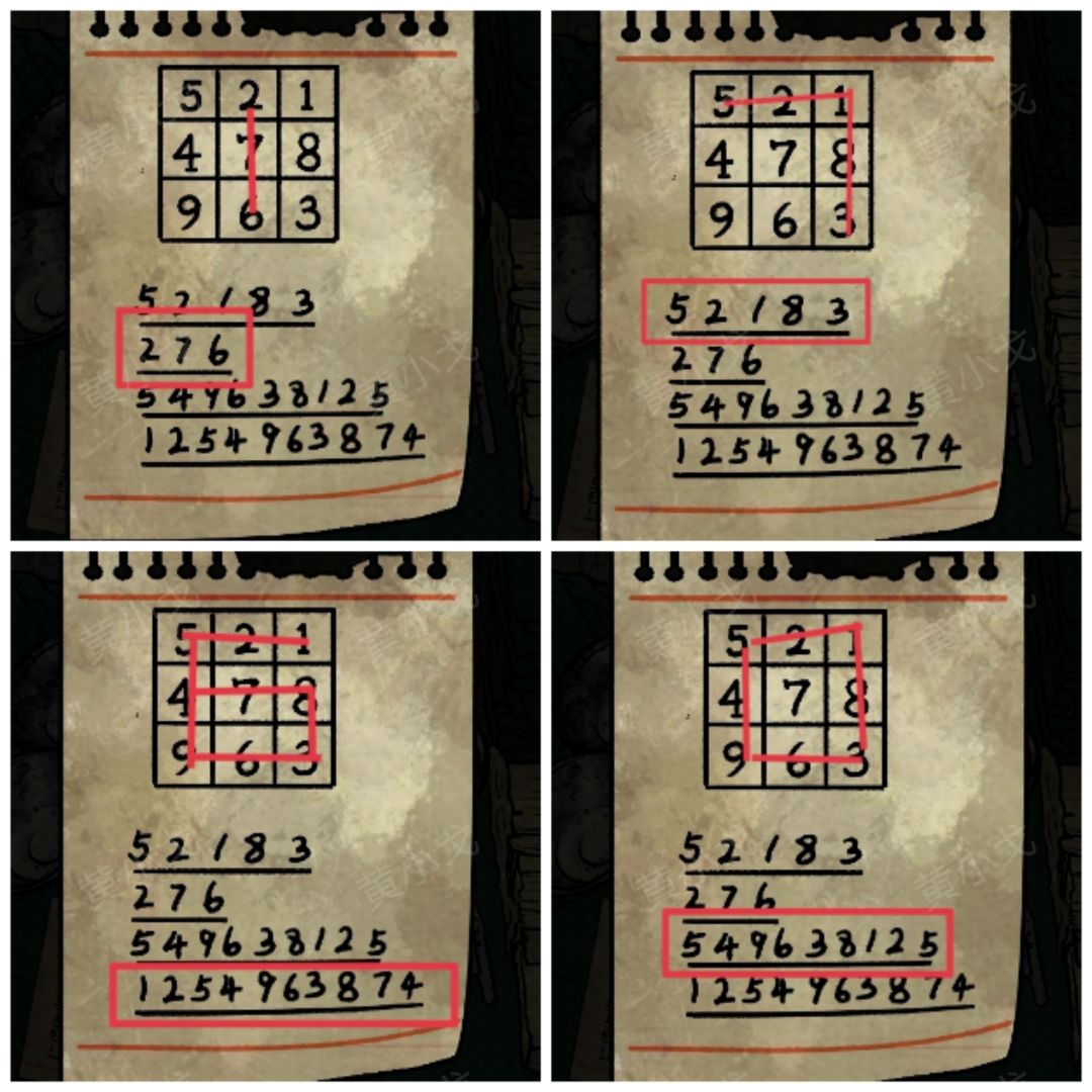 18.点击柜子上的箱子,根据贴纸下面的线索,调整密码锁(把3841调整到对应的形状:3-右下、8-左下、4-右、1-下)