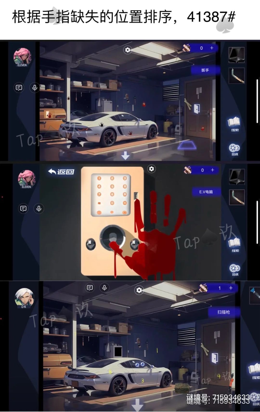 车库,使用【扫描枪】扫描对方视角学手印的对应位置。获得密码(41387#),告诉对方。