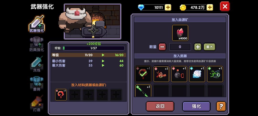 5:一般来说升级武器需要经验,血源矿和武器都能提供经验