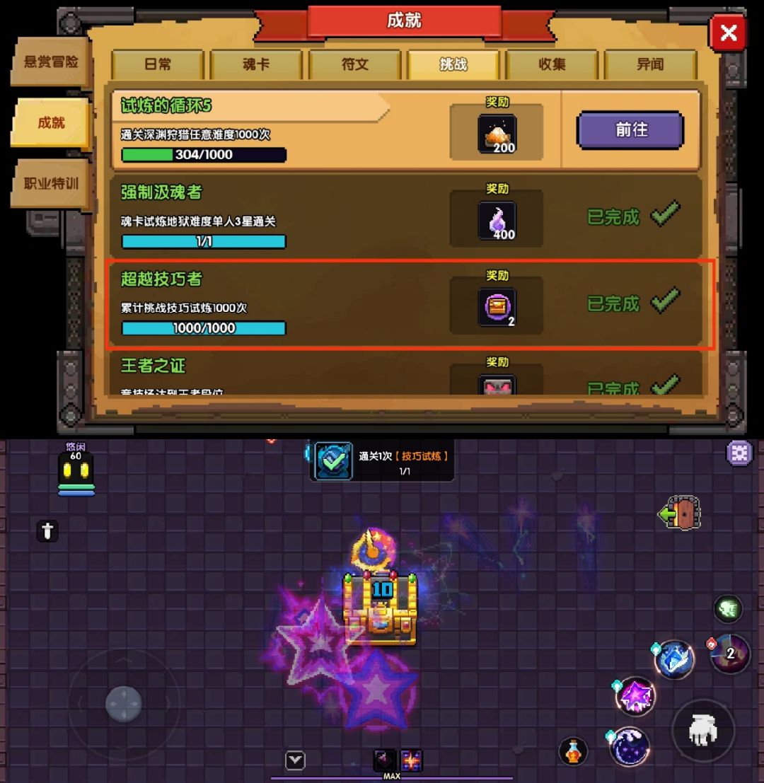 7:在任务-成就这里有一个超越技巧者的成就,如果想快速完成,只是要不领取宝箱的情况下,重复1000次就可以了