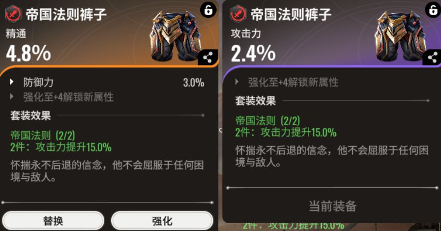 但是第二行的腰带、裤子和鞋子的主属性是随机的,建议挑选主属性是所需属性的百分比加成的装备,这对单英雄的实际战力还是有很大影响的。比如需要给熊猫配装,这时候其实选择右边的紫色装备更合适。