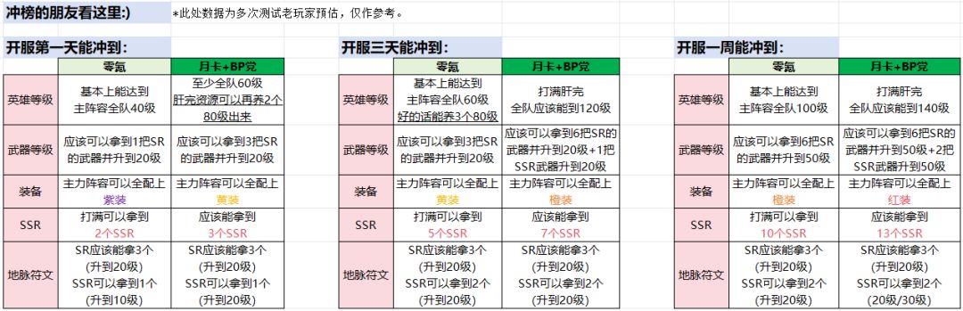 下图预估的是零氪和小氪肝满可以达到的练度,可以看出地脉符文和SSR个数等其实相差不大(如果是欧皇甚至可能反超),如果把奖励肝完其实不会跟氪金玩家差太多(除非是大氪佬)。