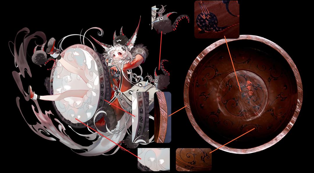 或许大多数人第一眼就能看出她的本体是个圆形的东西,毕竟这富有特色的裙子已经出卖了她。狸猫盘外服边缘的花纹,与古盘口沿的纹路一一对应,就连内裙的褶皱也颇具盘上卷云纹的风姿。狸猫盘身上着装尽显贵族气质,红黑的配色,亦是中国漆器配色的典型。围绕在她身旁,长着尖尖的耳朵,长长的尾巴的,有着圆润呆萌的外形的小家伙们,便是狸猫。