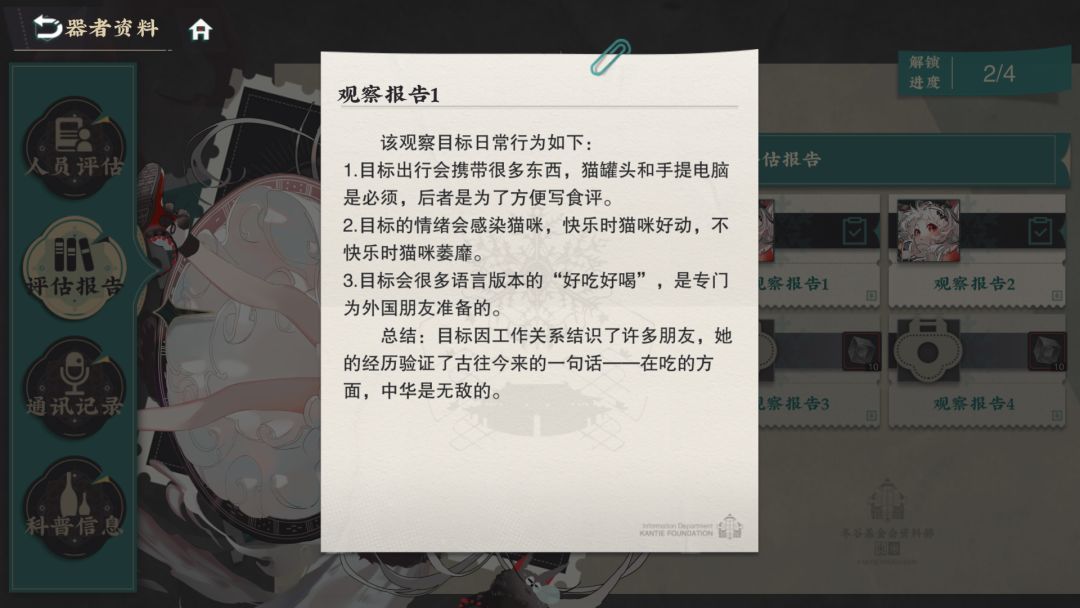 如果说立绘还原的是外表,那么性格还原的就是灵魂了。“爱猫”,“好吃”以及“热情”的特点无不刻在狸猫盘的骨子里。游戏中的狸猫盘小姐性格开朗,为人友善,无时无刻不在为身边的猫咪着想。而“吃好喝好”,则成了她的口头禅,劝食也成了她热衷的事,她也确实是这方面的专家。狸猫盘在劝食上能做到出其不意,攻其不备,跟学了兵法一样,甚至为了劝外国友人,她还掌握了各种语言的“吃好喝好”。不仅如此,为了让更多的人了解美食爱上美食,狸猫盘小姐还成为了一名兢兢业业的美食杂志主编,手提电脑和猫粮都是她的出门必需品,前者是为了随时编写美食评论。