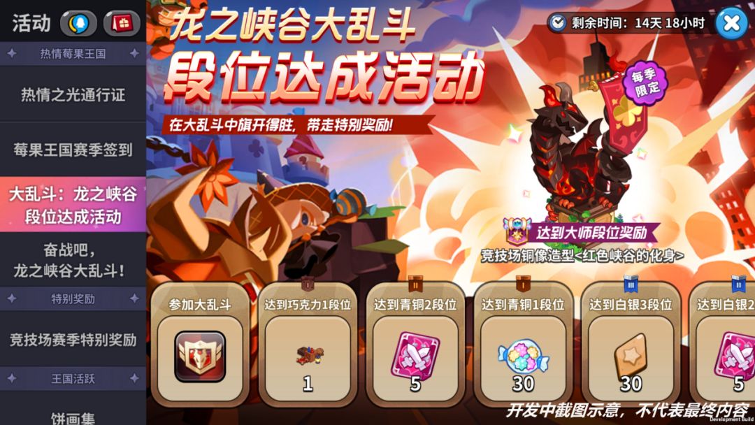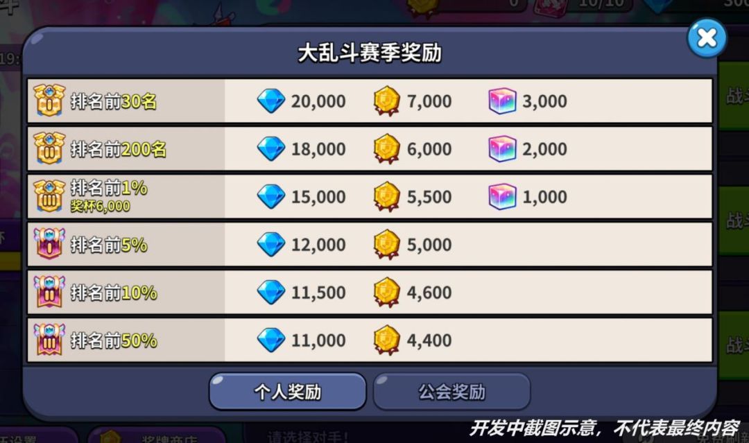 大乱斗玩法分为个人赛季奖励、公会赛季奖励、段位达奖励、累积战斗奖励——四个部分。其中赛季奖励带来大量的水晶、彩虹方块、奖牌等回馈,个人参与最低可获得「4000水晶」、「1000奖牌」;此外当公会奖杯累积大于15000,每位公会成员最低可获得「1000水晶」、「600奖牌」,奖励将会随着段位、积分的累积而提升。除了上述奖励外,在限时活动当中饼干朋友们还能收获「王国限定装饰」、「限定头像」等更多奖励,并解锁特别的剧情故事,探究龙之峡谷的真相,千万不要错过!