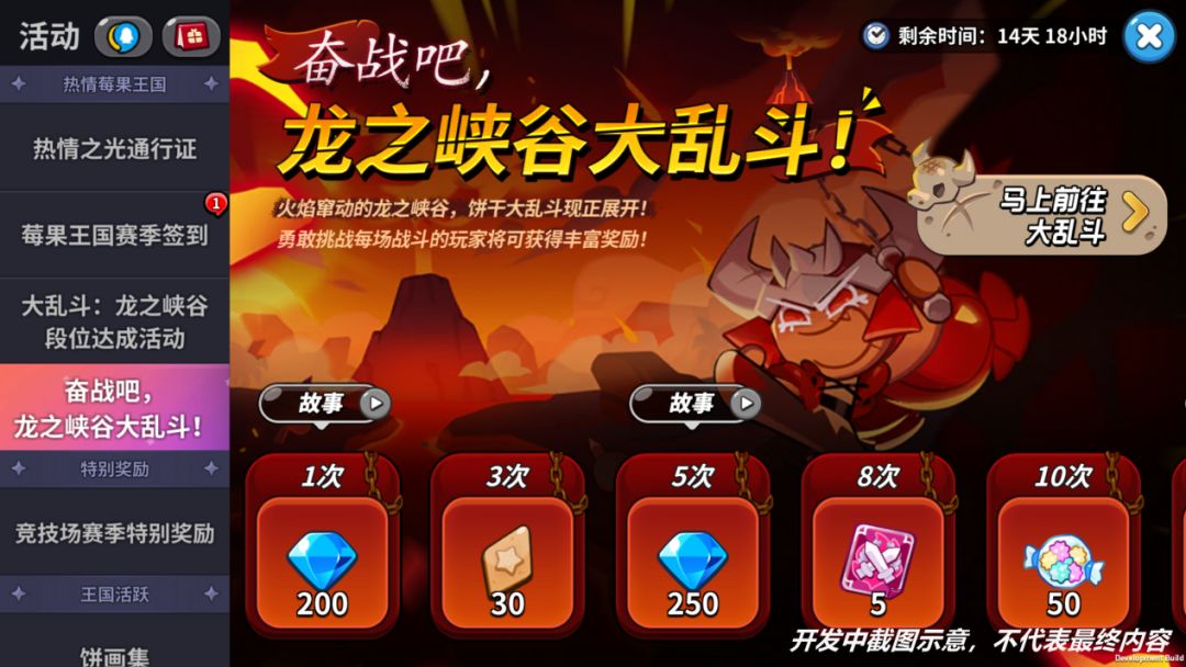 大乱斗为非定期活动,饼干朋友们可派出由不同饼干组成3支队伍参加战斗,在特殊的规则和效果下,与对手较量彼此的实力!进行大乱斗时,依照队伍编号顺序进行战斗,由获得更多胜利的一方获胜——在巨龙出没的峡谷,让心情随着岩浆一同沸腾吧!