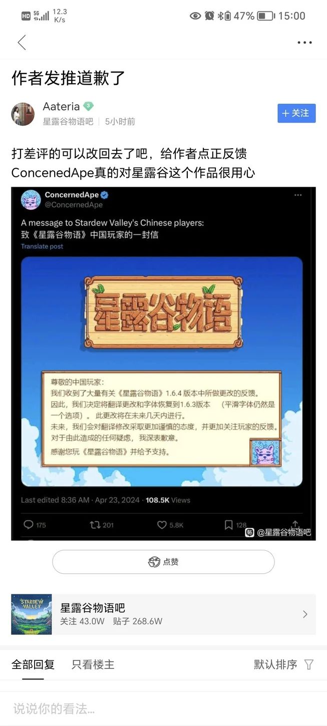 星露谷官推发文道歉,汉化退回1.6.3
