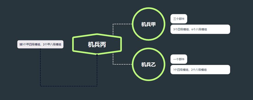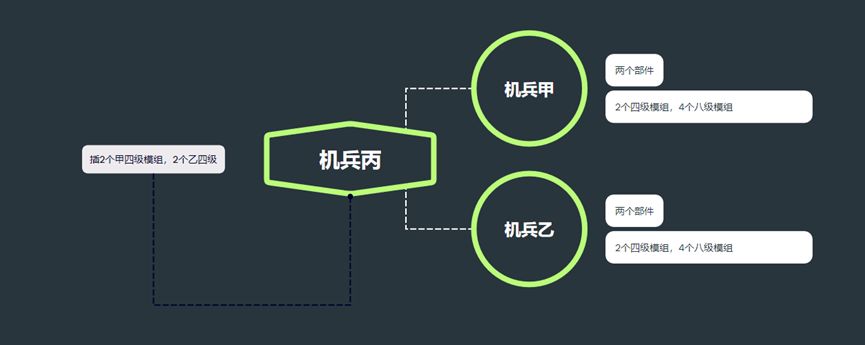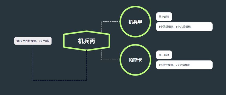 当然还有另外一种混搭方案,2+2的形式。依旧是以机兵甲和机兵乙组成机兵丙为例进行说明。依照此方案,机兵甲和机兵乙各自占据两个部位,那么机兵丙就能够获得两个机兵甲4级模组和机兵乙4级模组,以及4个机兵甲8级模组和机兵乙8级模组。剩下4个接口,可以分别插上两个机兵甲和机兵乙的4级模组。这样机兵丙能够保证完全发挥机兵甲和机兵乙的四级模组,但是缺点放弃了机兵甲和机兵乙的8级模组,而8级模组通常具有质变效果,这显然得不偿失了。