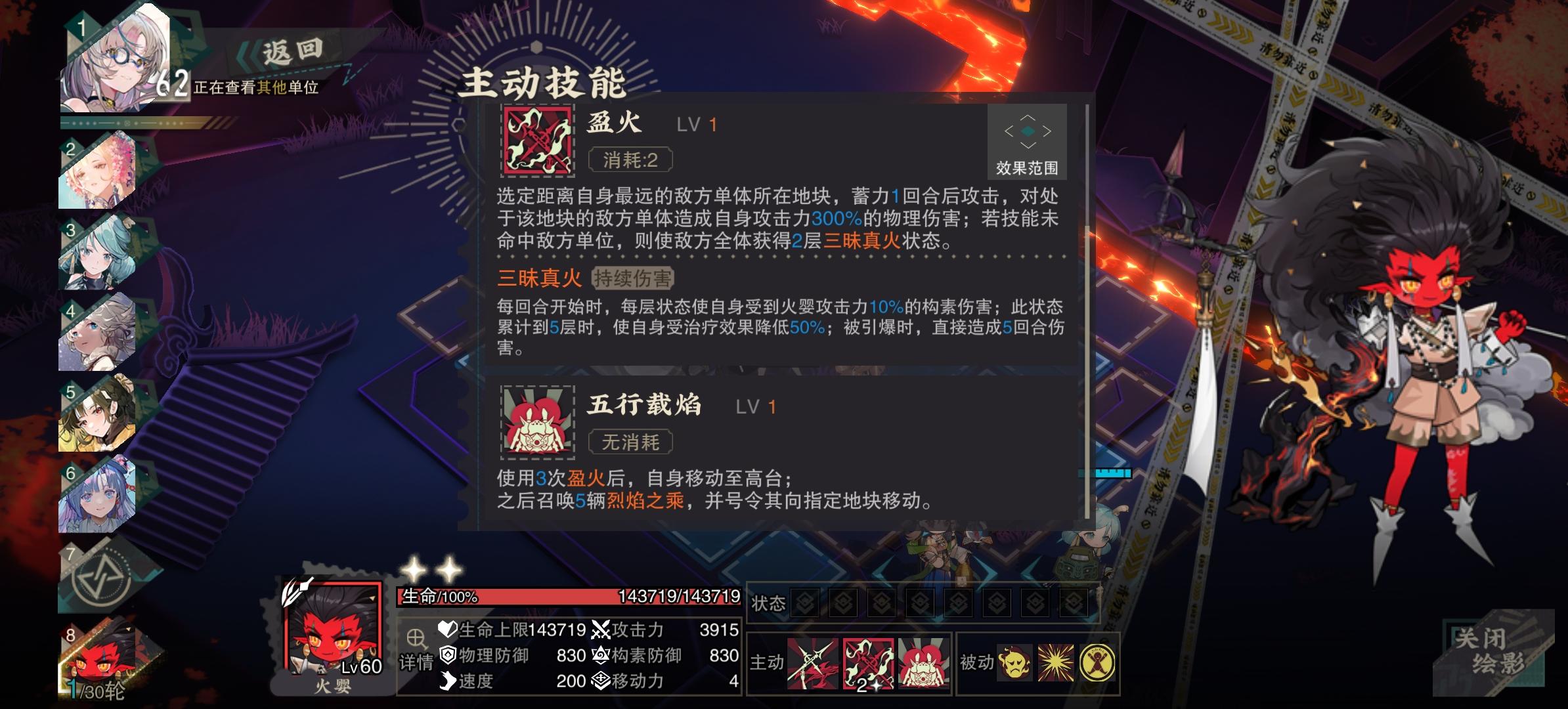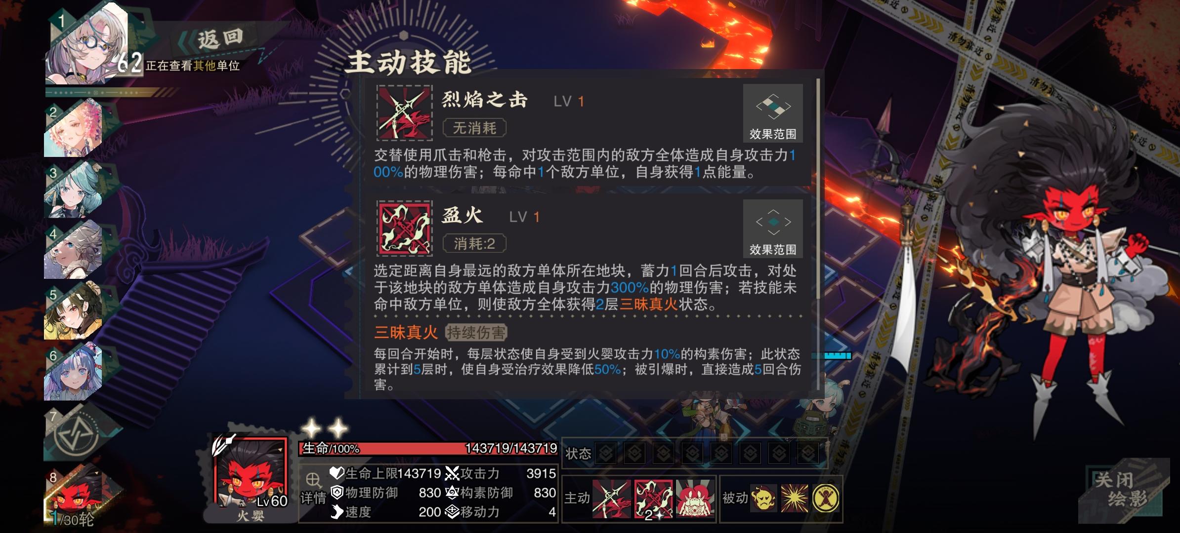 这个boss就有点难打了,混伤,所有伤害都会给一层三味真火,加上本身伤害倍率高,一技能就是横扫和直刺俩种形态轮换二技能选中一个最远的角色,蓄力一回合攻击,三倍的攻击力,没中给所有人俩层被动,三技能是用了三次长枪之后就叫五辆车,每有一只到终点爆一次伤害,全死完也爆一次,然后再爆一次三味真火伤害