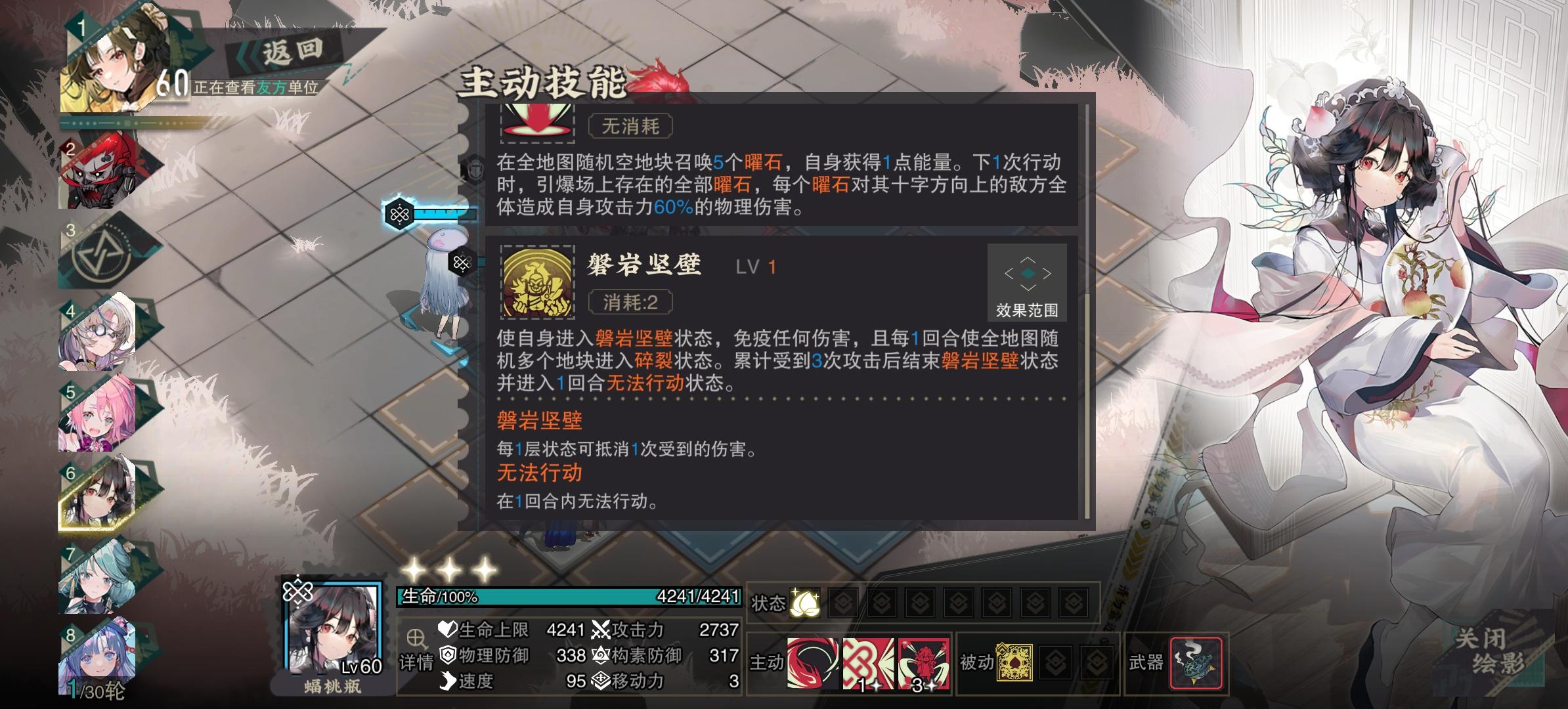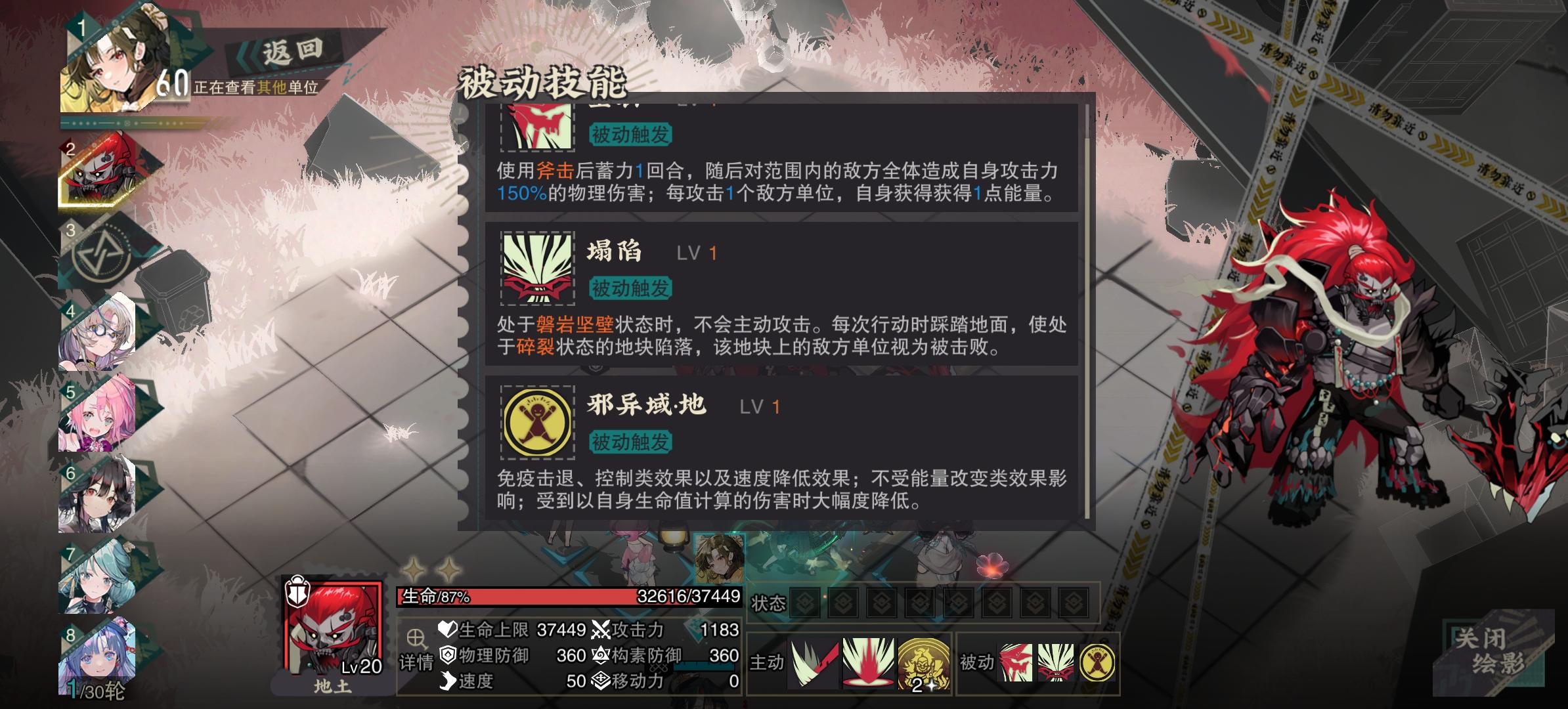 第三个技能地裂,boss首先会进入无敌状态,然后选定几个格子,一回合后格子清空秒杀格子上的人,boss的无敌只有三层,我推荐带战略,直接破俩层