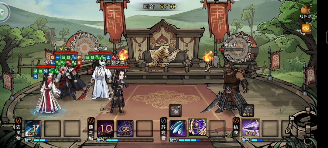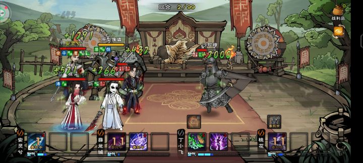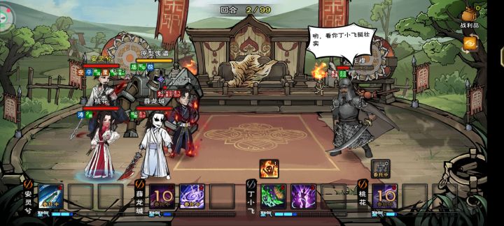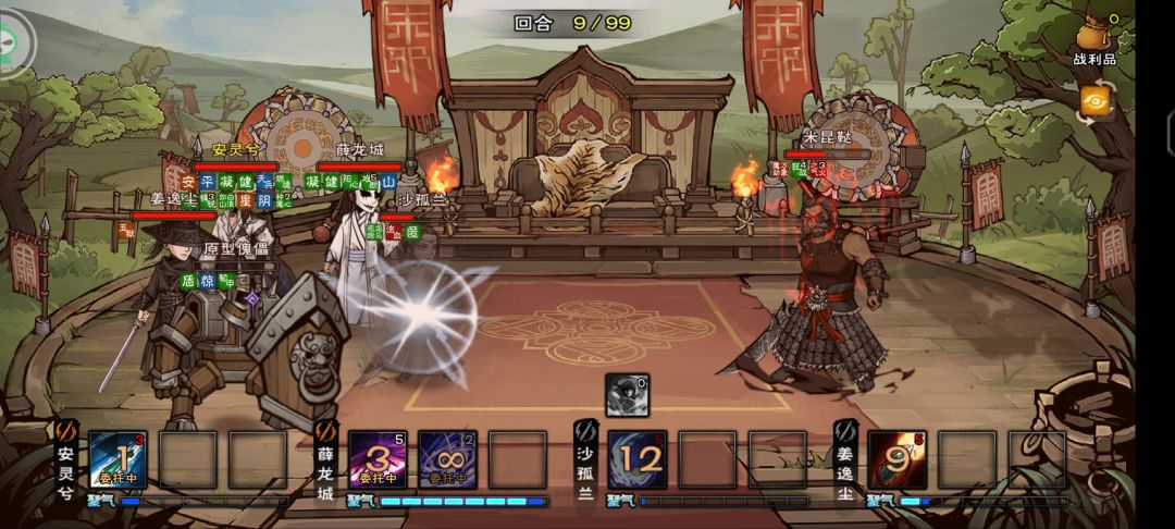 这里推荐上双剑,百战百识buff为10%免伤,50%破闪避。中路放根骨最高的工具人,抗不到点名的可以放一个血薄的工具人抗刀。开局副c放傀儡卡调息,sl道小不被招架闪避,一般第二回合就能打掉武圣半血。第二回合开始点名,半血触发弩箭收掉根骨最高工具人。然后点名臂力最高随从,这里是万象薛,能反弹日月双象debuff,把武圣自己干沉默了