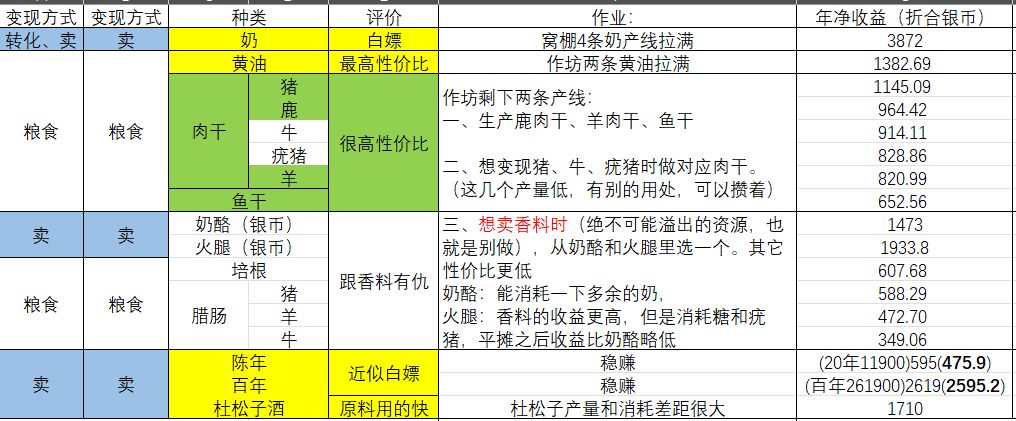 获利方式:奶酪、火腿,各种酒卖掉赚。奶优先转化黄油,多余的卖掉比转化为粮食赚(奶产量略大于需求)。其它转化为粮食。金酒不论吃不吃建筑的1.25加成,原材料是否购买都是稳赚。其他需要买原料做的东西都亏。