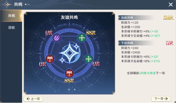 只有当一页魂卡都为UR的时候,才能激活UR共鸣,UR共鸣给的数下是SSR共鸣的一倍。