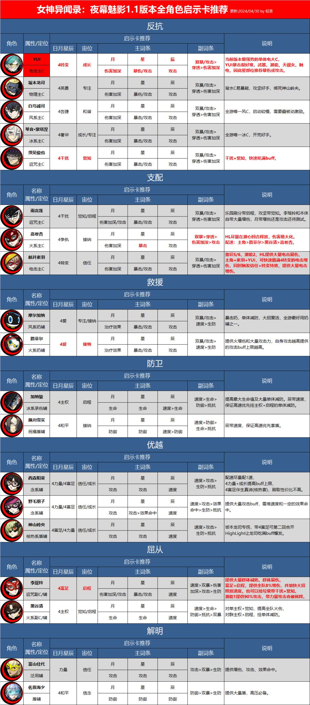 【女神异闻录:夜幕魅影】1.1版本全角色启示卡推荐 0425更新YUI