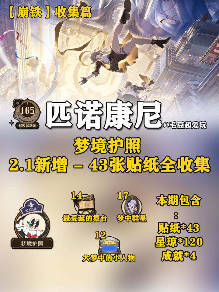 本期毛豆整理了一下2.1版本匹诺康尼新增<梦境护照>的贴纸点位,各位开拓者可以打开梦境护照,在“贴纸收藏夹”中快速查漏补缺,再点击对应的批次查看贴纸的获取方式。