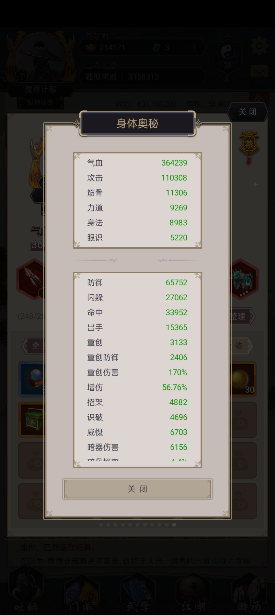 3.弟子挡刀问题,本人赌五人组的时候,经常28回合到33回合就死,我推算了一下,只要能活到40回合就基本能过,于是我拉高自身闪躲,降低弟子挡刀。棍枪49%挡刀,腿5%,拳10%,刀剑(15%)以上是根据自己弟子的上buff能力决定,我的枪棍弟子血量防御全部磨满,因此有自信开满挡刀,成型的枪弟子的肉度非常恐怖