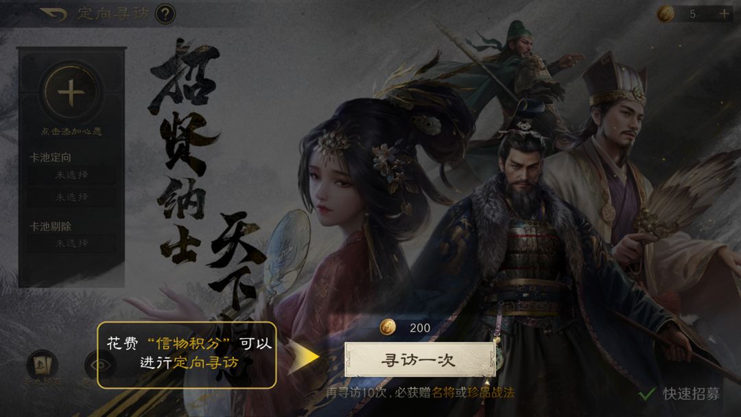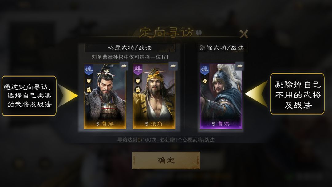 玩家可以通过定向寻访,寻访到自己需要的武将及战法,同样也可以剔除掉1个自己不用的武将及战法,这对游戏中玩家急需特定武将时,有着特殊的帮助。