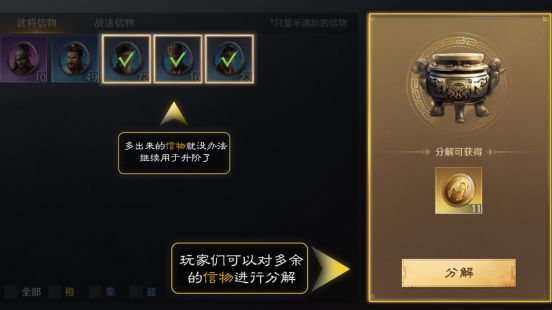 不过当武将或战法满阶后,多出来的信物就没办法继续用于升阶了。但玩家们可以对多余的信物进行分解,将信物分解为“信物积分”,“信物积分”可以用于“定向寻访”。