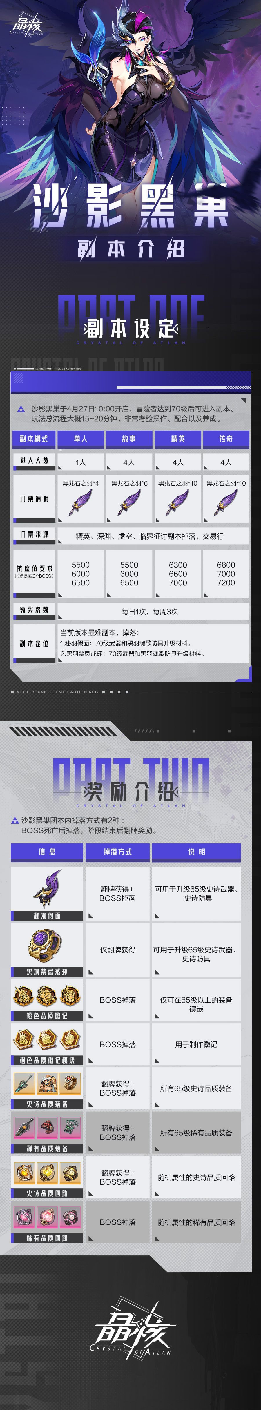 冒险者等级达到70级并完成对应任务后开启副本(4月27日10:00可正式进入),单人、故事、精英、传奇模式将同步解锁。通关副本将有可能掉落:黑羽禁忌戒环、秘羽假面、斯库尔&波吉特&夏洛特徽记及模块(仅可65级以上装备可镶嵌)、65级史诗装备等奖励。