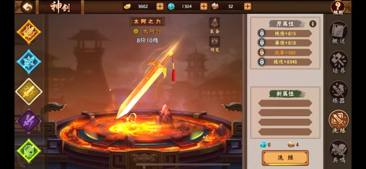 神剑养成分为:培养、炼器、洗练、共鸣。神剑培养