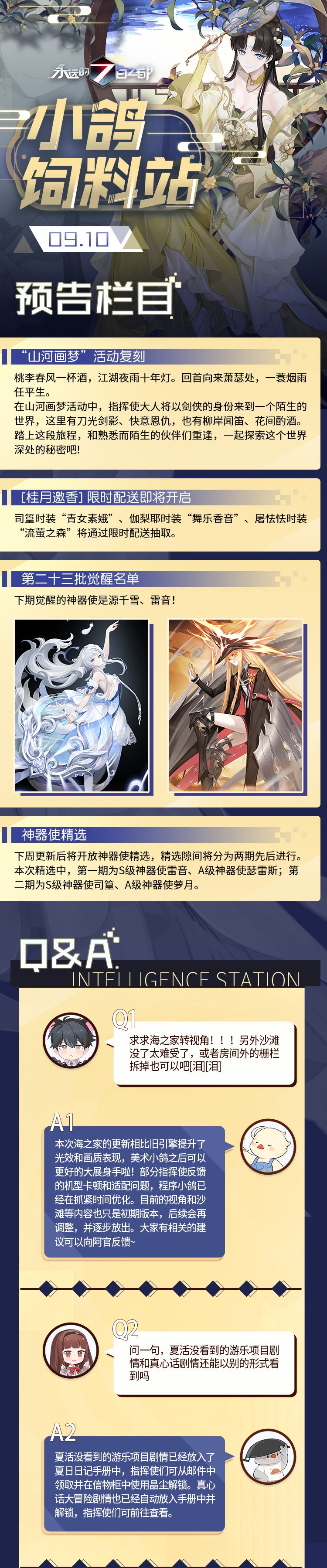期待已久的饲料站到来!今天的饲料站不仅带来“山河画梦”活动复刻情报、“桂月邀香”限时配送的最新消息。还有新一批觉醒神器使的图透,和海之家优化等问题的回复,赶快和7都督一起看看吧!