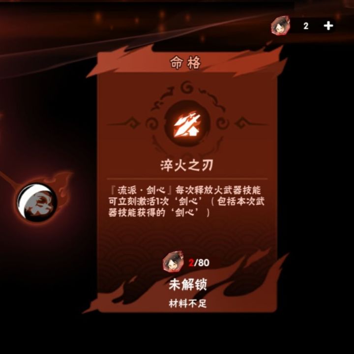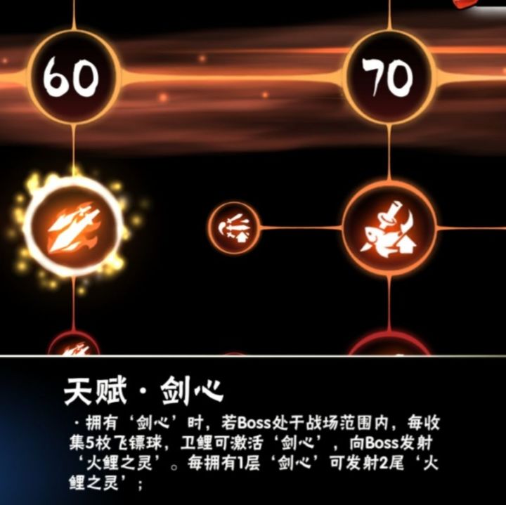 2:给卫鲤加功击力。可以通过释放火武器技能增加剑心层数(只有自身携带的火属性武器释放才增加,通过携带卡牌或者战场效果给的火武器技能不增加)