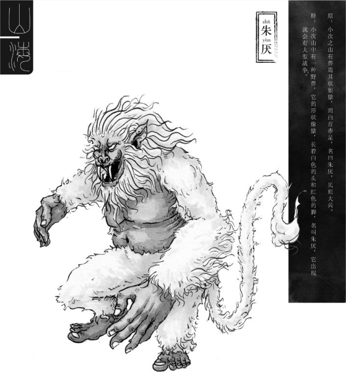 据《山海经-西山经》记载,“又西四百里,曰小次之山,其上多白玉,其下多赤铜。有兽焉,其状如猿,而白首赤足,名曰朱厌,见则大兵。”