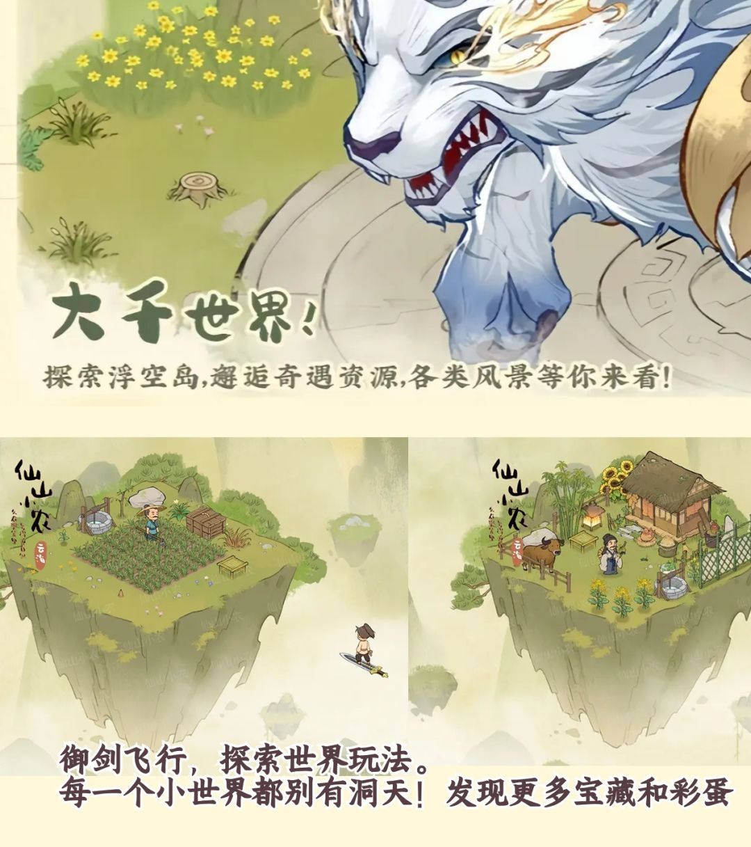 游戏的亮点正是巧妙结合了种田玩法和修仙题材,种田的同时,你也需要增长自己的修为,而解锁更多土地,建筑和家具,就会增加小山的灵气值,加速你的修炼,同时还有战斗系统,进入到小世界冒险,战胜各种精怪,获得更多的资源,开启你的修仙之路吧!