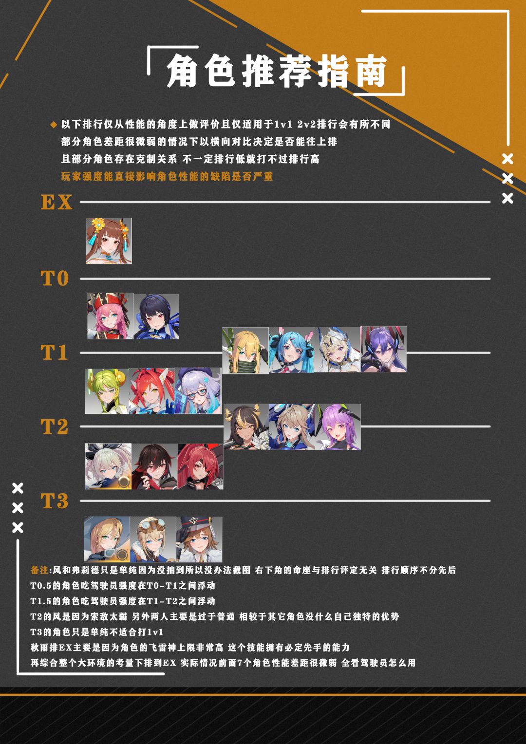 本贴主面向刚入坑的萌新玩家 提供一些参考建议 游戏的平衡性目前做的还不错 玩家强度能很大程度绝对战况结果 所以本篇攻略默认以玩家都是同水平以及角色都拿到了关键命座的情况下做出的强度推荐