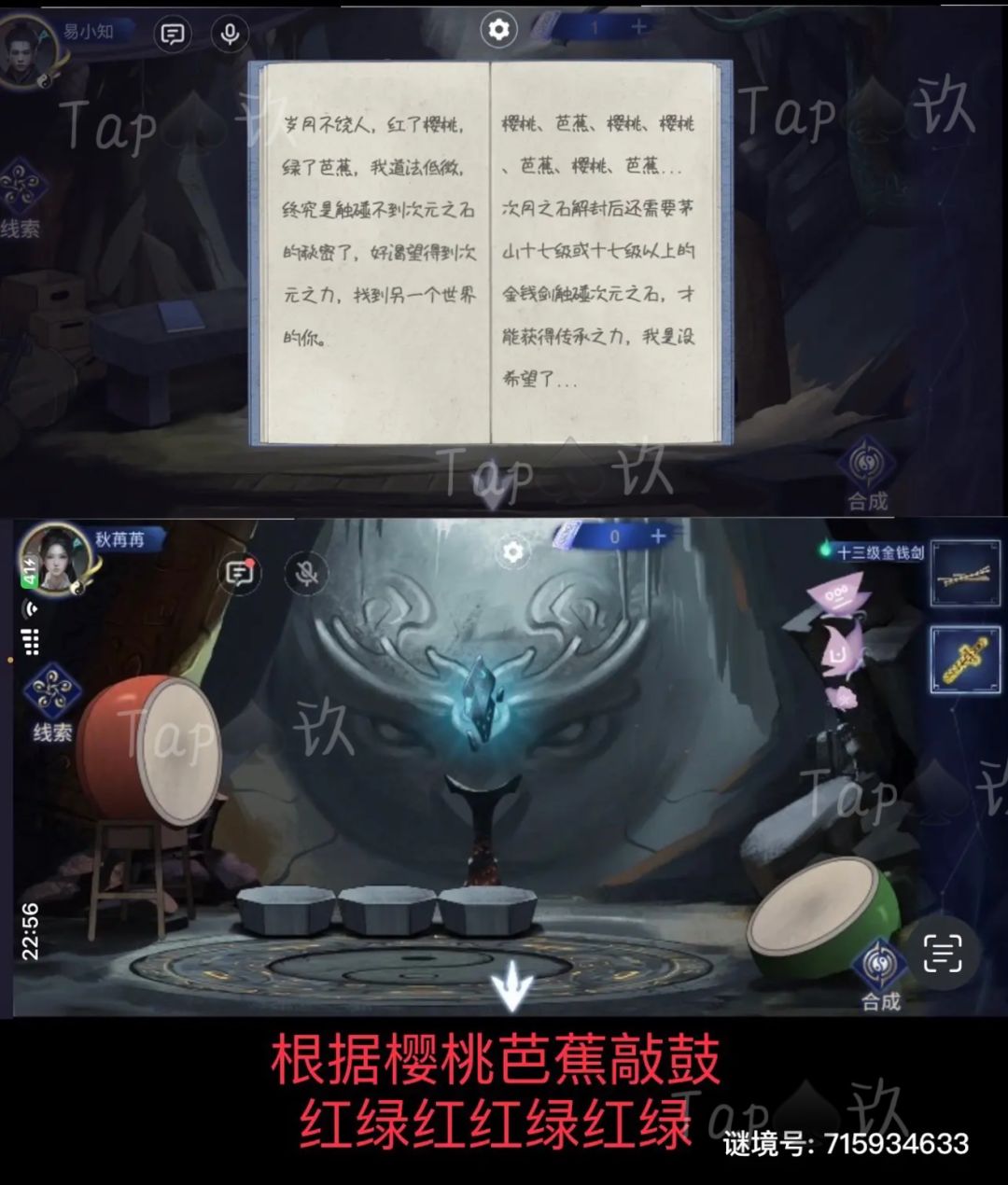 结合双方视角的线索。打开洞库中的石碑。获得【钟摆】传给对方。