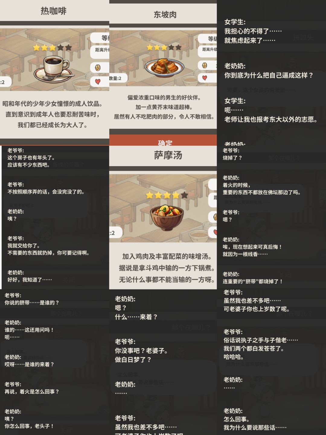 (好奇怪这个我本来以为是哪一部的另外一个名字,但下载下来发现确实是新的故事,界面排版美工介绍和游戏玩法乍一看就是食堂一,差点退出去,可剧情场景和一些人物又是陌生的,多了个收藏界面,而且这家店是老爷爷做饭老奶奶辅助(居然是爷爷做菜,那所以奶奶是后面才学会的?是了,后面爷爷叫奶奶自己学一学,以后能用上),感觉可能是新出的回忆食堂系列前传)