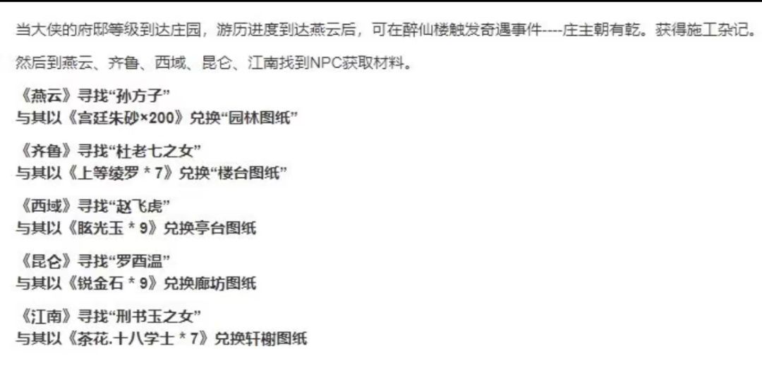 4、关于购物:每天必买是集市一层的五年十年悟道果、庙会读书500黄金、茶叶活动的布、唐门门票 、四艺门票、聚福园门票、杂耍门票,其他购买优先级顺序是:房子升级所需建筑材料>历练丹方和药材>灵芝>其余建筑材料>內练草>仙鹤草>6级房材料>开东厢房(建筑材料开派后用量很大,能买每天尽量买满,4级房之后全力攒6级房材料,如果忘了会卡很久的进度,六级房材料如下图所示)