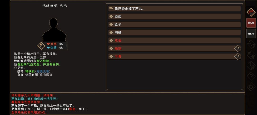 (2)战斗胜利后,[人物:巡捕首领 史进]陷入昏迷,对话 选择攻击(罪恶值增加)。